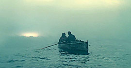 The end of the film. Theo, Kee, and the newborn are led to a dingy floating in a water tunnel that leads to the sea. There is a halo of light within the otherwise dark tunnel which illuminates them and follows them out until they reach the exit. Once they are out in open water, the atmosphere feels strangely claustrophobic. Although they have escaped the imminent menace of the shore, they are encircled by thick, white fog and endless ocean on all sides. Kee and the child sit facing Theo, whom is rowing the lifeboat. They are seeking the vessel “Tomorrow,” alone in the middle of the sea, shrouded in mist, no help or living thing within sight. The chaos of the city streets would almost seem a relief to the eerie isolation of their current surroundings. At this moment, the threesome is most vulnerable. Smothered by fog and endless ocean, they sway precariously in the swells, waiting.